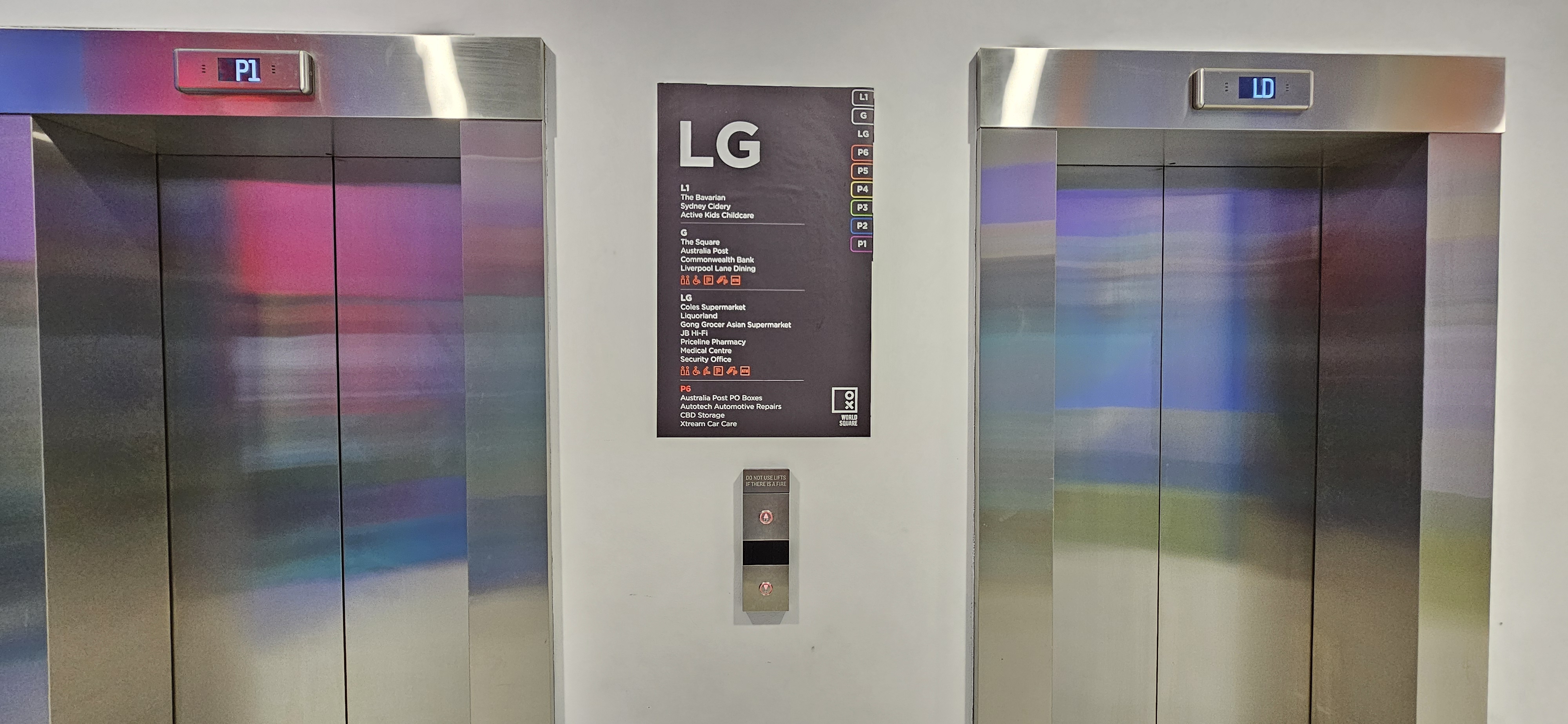 Liverpool St into World Square Shopping Centre courtyard. Turn left at the T2 store. Locate the car park Lift Lobby (opposite Australia POST) to your left.